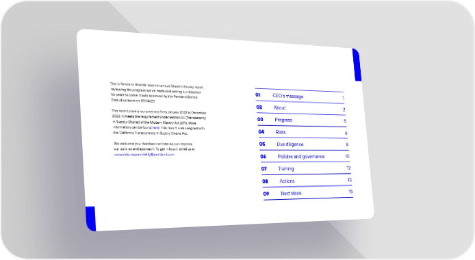 This is Pentland Brands’ seventh annual Modern Slavery report, reviewing the progress we’ve made and setting our direction 01 CEO’s message 1 for years to come. It was approved by the Pentland Brands Executive team on 07/04/23. 02 About 2 This report covers our progress from January 2022 to December 2022. It meets the requirement under section 54 (Transparency 03 Progress 5 in Supply Chains) of the Modern Slavery Act 2015. More information can be found here. This report is also aligned with 04 Risks 6 the California Transparency in Supply Chains Act. We welcome your feedback on how we can improve 05 Due diligence 8 our policies and approach. To get in touch, email us at [email protected] 06 Policies and governance 10 07 Training 12 08 Actions 13 09 Next steps 15