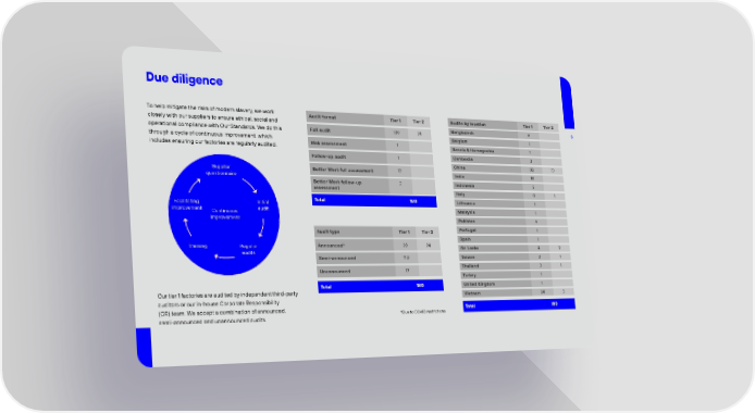 Due diligence To help mitigate the risks of modern slavery, we work Audit format Tier 1 Tier 2 Audits by location Tier 1 Tier 2 closely with our suppliers to ensure ethical, social and Bangladesh 9 8 operational compliance with Our Standards. We do this Full audit 139 24 through a cycle of continuous improvement, which Belgium 1 includes ensuring our factories are regularly audited. Risk assessment 1 Bosnia & Herzegovina 1 Follow-up audit 1 Cambodia 3 China 82 10 Supplier Better Work full assessment 13 India 10 questionnaire Better Work follow-up 2 Indonesia 5 assessment Italy 0 1 Facilitating Initial Total 180 Lithuania 1 improvement Continuous audit Malaysia 1 improvement Pakistan 6 Audit type Tier 1 Tier 2 Portugal 1 Spain 1 Training Regular Announced* 29 24 Sri Lanka 4 2 audits Semi-announced 110 Taiwan 2 7 Unannounced 17 Thailand 3 1 Turkey 1 Total 180 United Kingdom 1 Our tier 1 factories are audited by independent third-party Vietnam 24 3 auditors or our in-house Corporate Responsibility (CR) team. We accept a combination of announced, Total 180 semi-announced and unannounced audits. *Due to COVID restrictions