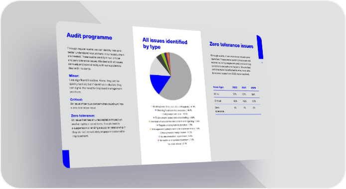 Audit programme All issues identi昀椀ed Zero tolerance issues by type Through regular audits, we can identify risks and Through audits, 11 zero tolerance issues were better understand how workers in our supply chain identi昀椀ed. These were: working hours are not 9 are treated. These audits identify minor, critical excessive, living wages are paid, and working and zero tolerance issues. We deal with all issues conditions are safe and hygenic. We worked seriously and work directly with our suppliers to with the factories a昀昀ected to ensure all zero deal with incidents. tolerance issues from 2022 were resolved. Minor: Less signi昀椀cant breaches. Alone, they can be quickly tackled, but if identi昀椀ed in clusters they Issue type 2022 2021 2020 can signal the need for improved management practices. Minor 57% 57% 58% Critical: Critical 42% 42% 40% An issue of serious concern that could turn into Working conditions are safe and hygienic | 61.4% a zero tolerance issue. Zero 1% 1% 2% Working hours are not excessive | 14.4% tolerance Zero tolerance: Living wages are paid | 13.4% An issue that has an unacceptable impact on Environment, waste and other 昀椀ndings | 4.4% worker rights or conditions. It could lead to Freedom of association and collective bargaining | 2.6% a suspension or ending a supplier relationship if Regular employment is provided | 1.5% they do not immediately engage in sustainable Management systems and code implementation | 1.5% improvement. Employment is freely chosen | 0.3% No discrimination is practised | 0.3% No harsh or inhumane treatment | 0.1% No child labour | 0.1%