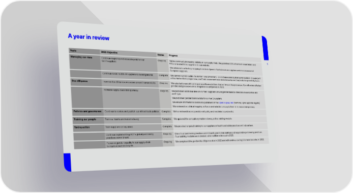 A year in review Topic 2022 Objective Status Progress Managing our risks Continue mapping and assessing risk for our Ongoing We’re continually increasing visibility in our supply chain. We published 69% of our nominated fabric and 5 tier 2 suppliers 91% nominated trims suppliers on our website. We extended our factory mapping to include Speedo North American suppliers and more nominated European suppliers. Continue social audits of suppliers to investigate risk Complete We carried out 180 audits, 156 for tier 1 and 24 for tier 2. 164 of these were by third-party auditors, 15 were part of the Better Work programme, and 1 risk assessment was undertaken by our Corporate Responsibility team. Due diligence Improve due diligence processes around human rights Ongoing We selected a new ethical mapping software platform that will impact key processes. We will review a昀昀ected policies and processes once integration is completed in 2023. Increase supply chain transparency Ongoing We published additional data on our tier 1 suppliers around gender balance, freedom of association and audit type. We published gender balance data for our tier 2 suppliers. We ensure information is biannually published on the Open Supply Hub (formerly Open Apparel Registry). We reviewed our ethical mapping software and selected a new platform to increase transparency. Policies and governance Continue to review and publish our ethical trade policies Complete We’ve reviewed our responsible exit policy and restricted countries list. Training our people Train our teams on modern slavery Complete We updated the compulsory modern slavery online training module. Taking action Train suppliers on key areas Complete We provided targeted training to our suppliers on health and safety practices and labour laws. Continue implementing ACT’s global purchasing Ongoing One of our purchasing practice commitments was to train sta昀昀 around responsible purchasing practices. practices commitment Four training modules were created, which will be rolled out in 2023. Focus on gender equality in our supply chain Ongoing We completed the gender due diligence pilot in 2022 and will continue testing it in more factories in 2023. to improve women’s rights