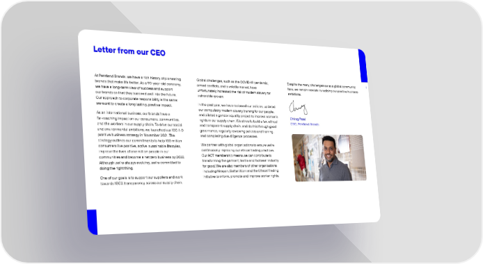 Letter from our CEO At Pentland Brands, we have a rich history of pioneering Global challenges, such as the COVID-19 pandemic, Despite the many challenges we as a global community 1 brands that make life better. As a 90-year-old company, armed con昀氀icts, and a volatile market, have face, we remain resolute in realising our positive business we have a long-term view of success and support unfortunately increased the risk of modern slavery for ambitions. our brands so that they succeed well into the future. vulnerable groups. Our approach to corporate responsibility is the same: we want to create a long lasting, positive impact. In the past year, we have reviewed our policies, updated our compulsory modern slavery training for our people, As an international business, our brands have a and piloted a gender equality project to improve women’s Chirag Patel far-reaching impact on our consumers, communities, rights in our supply chain. We strive to build a fair, ethical CEO, Pentland Brands and the workers in our supply chain. To drive our social and transparent supply chain, and do this through good and environmental ambitions, we launched our 100-1-0 governance, regularly reviewing policies and training, positive business strategy in November 2021. The and completing due diligence processes. strategy outlines our commitments to help 100 million consumers live positive, active, sustainable lifestyles, We partner with global organisations to ensure we’re improve the lives of one million people in our continuously improving our ethical trading practices. communities and become a net zero business by 2032. Our ACT membership means we can contribute to Although we’re always evolving, we’re committed to transforming the garment, textile and footwear industry doing the right thing. for good. We are also members of other organisations including Nirapon, Better Work and the Ethical Trading One of our goals is to support our suppliers and work Initiative to inform, promote and improve worker rights. towards 100% transparency across our supply chain.