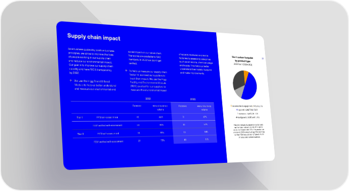 32 Supply chain impact As a business guided by positive business principles, we strive to improve the lives of people working in our supply chain and reduce our environmental impact. Our goal is to improve our supply chain visibility and have 100% transparency by 2032. We use the Higg Brand & Retail Module to help us better understand and measure our environmental and social impact on our value chain. The scores are available to SAC members. In 2022 we didnt get verified. To help us measure our supply chain footprint, we need our suppliers to track their impact. We use the Higg Facility and Environmental Module (FEM) as a tool for our suppliers to measure the environmental impact of apparel, footwear and textile factories by assessing categories such as emissions, chemical usage and waste. This helps us better understand their holistic footprint and make improvements. 2021 2022 Factories Annual business volume Factories Annual business volume Tier 1 FEM self-assessment 45 80% 71 87% FEM verified self-assessment 30 82% 42 57% Tier 2 FEM self-assessment 38 45% 56 84% FEM verified self-assessment 27 73% 48 81% Tier 1 carbon footprint by product type 2021 tier 1 CO2e (KG) accessories & equipment | 973,715 | 7% apparel | 6,867,583 | 50% footwear | 1,647,274 | 12% hardgoods | 4,332,664 | 31% This chart shows the assembly portion and not the total carbon footprint of the entire products. It represents 81% of the production volume for 2021 using the Higg FEM and Higg verified FEM data, excluding Speedo North America and licensee business.