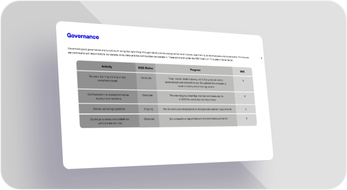 14 We embed good governance and a culture of doing the right thing through robust policies and governance structures, legal training for all employees, and social audits. This ensures we continue to act responsibly to our people, consumers and the communities we operate in. These actions fall under the WEF Metric of Principles of Governance. Governance Activity 2022 Status Progress SDG Review e-learning training on key compliance areas. Complete These include modern slavery, anti-bribery and corruption, personal data and competition law. We updated the compulsory modern slavery online training module. 8 Continue with risk assessment across key business functions. Complete The internal group identifies, monitors and measures risk. In 2022 the committee met three times. 17 Review upcoming legislation. Ongoing We reviewed upcoming legislative changes and customer requirements. 8 Continue to review and publish our ethical trade policies. Complete We reviewed our responsible exit and restricted countries list. 8