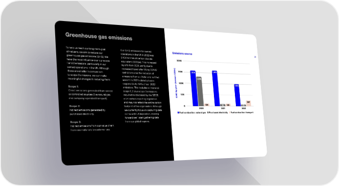 28 To help us reach our long-term goal of net zero, we aim to reduce our greenhouse gas emissions (GHG). We have the most influence over our scope 1 and 2 emissions, particularly in our owned operations in the UK. Although these are smaller in comparison to scope 3 emissions, we can make meaningful changes in reducing them. Scope 1: Direct emissions generated from owned or controlled sources (like natural gas and company-operated transport). Scope 2: Indirect emissions generated by purchased electricity. Scope 3: Indirect emissions from our value chain, from raw materials to customer use. Our GHG emissions for owned operations in the UK in 2022 was 2,904 tonnes of carbon dioxide equivalent (tCO2e). This increased by 61% from 2021, partly due to increased travel after lifting COVID restrictions and the inclusion of emissions from air, hotel and rail that werent in 2021s data but were responsible for 54% of our 2022 emissions. This includes all material scope 1, 2 plus scope 3 emissions required to disclosed by the SECR, a UK carbon reporting legislation, and may not reflect the entire carbon footprint of the organisation. Although we currently focus on capturing data in line with UK legislation, moving forward well start gathering data from our global regions. Greenhouse gas emissions Emissions source GHG by year (tonnes CO2e) Fuel combustion: natural gas Purchased electricity Fuel combustion: transport 2000 1000 1500 500 0 2020 2021 2022 1,575 1,294 124 1,593 90 123 1,002 80 269