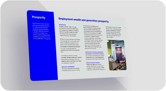 39 We build brands and products with a social purpose. We work to create long-term value to society through employment, financial investment, product innovation and taxes. This section covers the Sustainable Development Goals 8, 9 and 10 and the WEF Metric Prosperity. Employment We seek to attract, retain, motivate and reward our people by establishing and maintaining a suitable, competitive salary and benefit programme, while remaining mindful of our financial responsibility to our shareholders. To help our people with the cost of living crisis, we applied an enhanced in-year salary increase for our lower earners (applied from July 2022) and a further annual salary increase for all employees from 2023, bringing forward the application from April 2023 to January 2023. In line with our positive business principles, we have a salary sacrifice that allows senior employees in the UK to lease fully electric cars. More information can be found on page 30. Economic contribution We report corporation tax payable in the UK and overseas in our entity accounts and consolidated group financial statements. We also annually report our total corporate taxes paid and payable across the whole Pentland Group on a country-by-country basis to relevant tax authorities. Our economic contribution in respect of taxation covers business taxes, indirect taxes including VAT, goods and services taxes and customs duties and employment taxes. Pentland Brands was cash generative in FY2022 for the year at 39.6 million year to date (excluding Speedo North America). Government economic contribution We received UK Government funding for two new job placements via the Kickstart Scheme (as of April 2022), designed for young people receiving Universal Credit. Indirect economic impacts Supply chain delays, the Ukraine invasion and the cost of living crisis all impacted our retail operations in 2022. Lockdowns in China in the first quarter of 2022 resulted in supply chain delays and the invasion of Ukraine by Russia resulted in us pausing our trading in Russia. We worked to swiftly and smoothly mitigate these risks. More information on these risks can be seen on page 17. Prosperity Employment wealth and generation prosperity