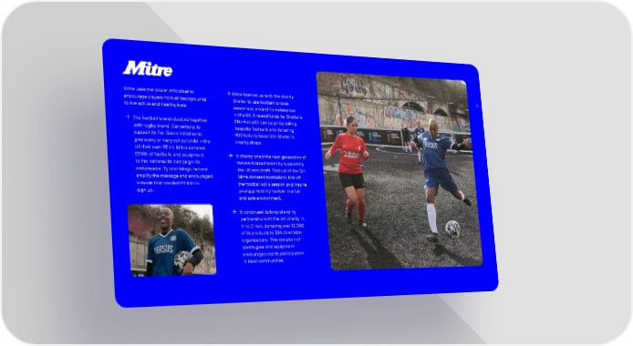 9 Mitre uses the power of football to encourage players from all backgrounds to live active and healthy lives. The football brand clubbed together with rugby brand, Canterbury, to support its Fair Game initiative to give every primary school child in the UK their own PE kit. Mitre donated 100k of footballs and equipment to the nationwide campaign. Its ambassador, Tyrone Mings, helped amplify the message and encouraged schools that needed PE kits to sign up. Mitre teamed up with the charity Shelter to use football to raise awareness around homelessness in the UK. It raised funds for Shelters #NoHomeKit campaign by selling bespoke footballs and donating 400 balls to be sold in Shelters charity shops. It championed the next generation of female football talent by supporting the UK non-profit, Festival of the Girl. Mitre donated footballs to kick off the football skills session and inspire young girls to try football in a fun and safe environment. It continued its long-standing partnership with the UK charity In Kind Direct, donating over 12,000 of its products to 336 charitable organisations. This donation of sports gear and equipment encourages sports participation in local communities.