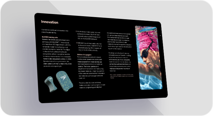 36 Our brands continue to innovate in the area of sustainability. BLOOM training aids Speedo has developed a kickboard and pull buoy with BLOOM. The products are made from 10% algae bloom, with the remainder made from ethylene-vinyl acetate (a polymer material). This algae is cleared from polluted freshwater ecosystems where it would be harmful to marine environments. This renewable material also sequesters carbon. In 2022, Speedo helped turn green water into clean water, with the number of BLOOM products sold equating to: 90,396 litres of clean water returned to the environment / 93,717 M of air cleaned capturing 68.3 kilograms of CO 2 for the BLOOM kickboard 259,464 litres of clean water returned to the environment / 268,997 M of air cleaned capturing 196.1 kilograms of CO 2 for the BLOOM pull buoy. Biofuse 2.0 goggles To try to reduce the products impact on the planet, Speedo has constructed these goggles from materials that use less fossil-based carbons vs traditional plastics. The frame, gaskets and adjustment mechanism are made using bio-based materials meaning a portion of the materials is derived from renewable raw materials such as sugar cane and castor oil. The lens, side clip cover and strap holder are made in part using bio-circular materials (originating partially from bio-waste and residues such as soybean oil), using a mass-balance approach. This means that fossil and bio-circular raw materials are mixed in production, and the total input of bio-circular material is tracked through the production cycle, ensuring an appropriate allocation is given to the material. The strap currently doesnt use any renewable sources, Speedo is looking at possible solutions to reduce or eliminate the use of non-renewable material sources. The manufacturing partner has switched their factory to be partially powered by solar power, helping to reduce their reliance on fossil fuel. *Data relates to products sold in the 2022 financial year. Impact calculated by the Bloom Certification System. Innovation