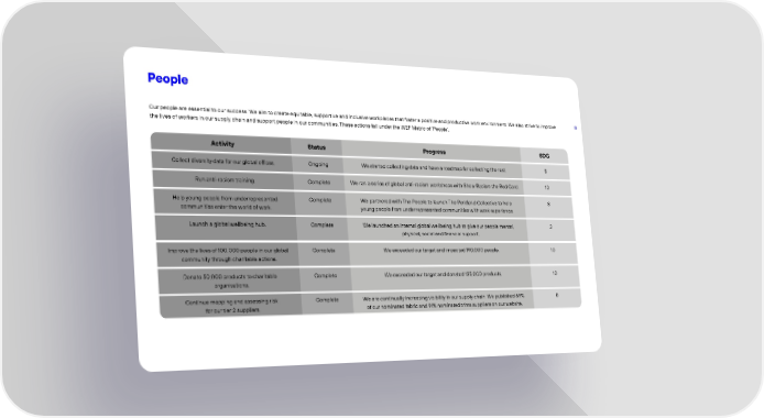 18 Our people are essential to our success. We aim to create equitable, supportive and inclusive workplaces that foster a positive and productive work environment. We also strive to improve the lives of workers in our supply chain and support people in our communities. These actions fall under the WEF Metric of People. People Activity Status Progress SDG Collect diversity data for our global offices. Ongoing We started collecting data and have a roadmap for collecting the rest. 5 Run anti-racism training. Complete We ran a series of global anti-racism workshops with Show Racism the Red Card. 10 Help young people from underrepresented communities enter the world of work. Complete We partnered with The People to launch The Pentland Collective to help young people from underrepresented communities with work experience. 8 Launch a global wellbeing hub. Complete We launched an internal global wellbeing hub to give our people mental, physical, social and financial support. 3 Improve the lives of 100,000 people in our global community through charitable actions. Complete We exceeded our target and impacted 190,000 people. 10 Donate 50,000 products to charitable organisations. Complete We exceeded our target and donated 135,000 products. 10 Continue mapping and assessing risk for our tier 2 suppliers. Complete We are continually increasing visibility in our supply chain. We published 69% of our nominated fabric and 91% nominated trims suppliers on our website. 8