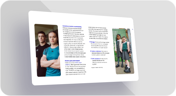 35 Canterbury tackles sustainability Without compromising the strength and durability the rugby brand is known for, Canterbury is working towards increasing the use of recycled materials in its products. Its developed an internal sustainability criterion for its products, outlining that a minimum of 75% of the product must use materials such as organic cotton or recycled polyester with no harmful chemicals. Using recycled polyester reduces virgin plastics, and using organic cotton is less harmful to the natural environment its grown in. Its committed to 50% of its teamwear product range meeting these criteria in 2024 (EMEA total apparel production). Kickers goes plant-based Kickers launched a 100% vegan collection offering parents more choice for their Back to School shop without trading quality, price, accessibility or style. The PETA and Vegan approved plant-based material is made from 75% plant-based materials from corn and cereals (grown for non-food purposes and 100% GMO free) and FSC-certified viscose. The remaining 25% is a synthetic material to ensure durability. This is one of their bestselling ranges, so it can make a significant impact. This material is responsibly sourced and bio-based. Energy: It reduces the energy needed for production from non-renewable sources by 44% more than that of materials that arent plant-based*. Carbon emissions: This material reduces emissions by 15% compared to other synthetic materials.* CFC emissions: Producing this material reduces harmful Chlorofluorocarbon emissions by 32%*. *Based on material tests only.
