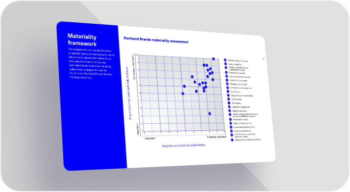 16 We engage with our key stakeholders to identify topics of importance to inform decisions on issues that matter to our business. Information on our key business decisions and any resulting stakeholder engagement can be found in our Pentland Brands Section 172 statement here. Materiality framework Importance to external stakeholders Importance to internal stakeholders Important Important Extremely important Extremely important 1 0 0 1 2 3 4 5 6 7 8 9 10 2 3 4 5 6 7 8 9 10 M S H T P B U N A E F O Q C K D I R J G L A Ethical working conditions B Carbon reduction C Helping consumers to live a sustainable lifestyle D Manufacturing waste E Use of sustainable materials F Sustainable packaging G Diversity and inclusion H Transparency in supply chain I Governance J Supporting our communities K Chemical use L Microfibres M Employee engagement N Safety of products O Climate change impacts (extreme weather/availability resource) P Renewable energy Q Water use in production R Economic/political impacts S Impact on biodiversity T Circular economy and new business models U Responsible purchasing practices Pentland Brands materiality assessment
