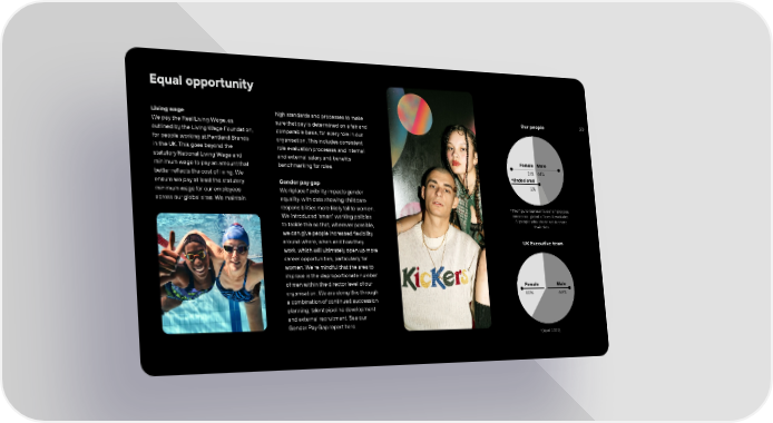 20 Living wage We pay the Real Living Wage, as outlined by the Living Wage Foundation, for people working at Pentland Brands in the UK. This goes beyond the statutory National Living Wage and minimum wage to pay an amount that better reflects the cost of living. We ensure we pay at least the statutory minimum wage for our employees across our global sites. We maintain high standards and processes to make sure that pay is determined on a fair and comparable basis, for every role in our organisation. This includes consistent role evaluation processes and internal and external salary and benefits benchmarking for roles. Gender pay gap Workplace flexibility impacts gender equality, with data showing childcare responsibilities more likely fall to women. We introduced smart working policies to tackle this so that, wherever possible, we can give people increased flexibility around where, when and how they work, which will ultimately open up more career opportunities, particularly for women. Were mindful that the area to improve is the disproportionate number of men within the director level of our organisation. We are doing this through a combination of continued succession planning, talent pipeline development and external recruitment. See our Gender Pay Gap report here. Equal opportunity Our people *Undeclared 5% Female 51% Male 44% *The figure represents our employees across our global offices. It excludes 77 people who chose not to share their data. UK Executive team *(April 2022) Female 40% Male 60%